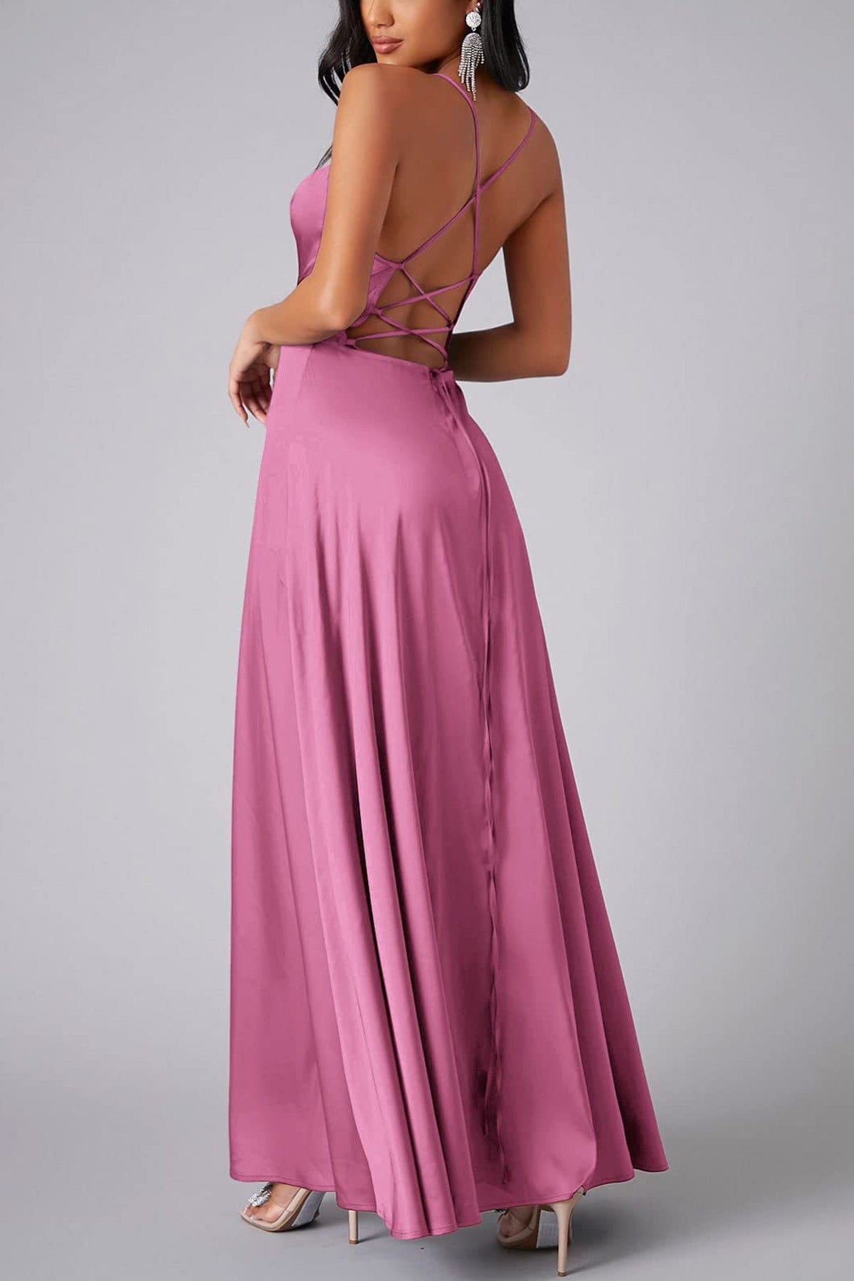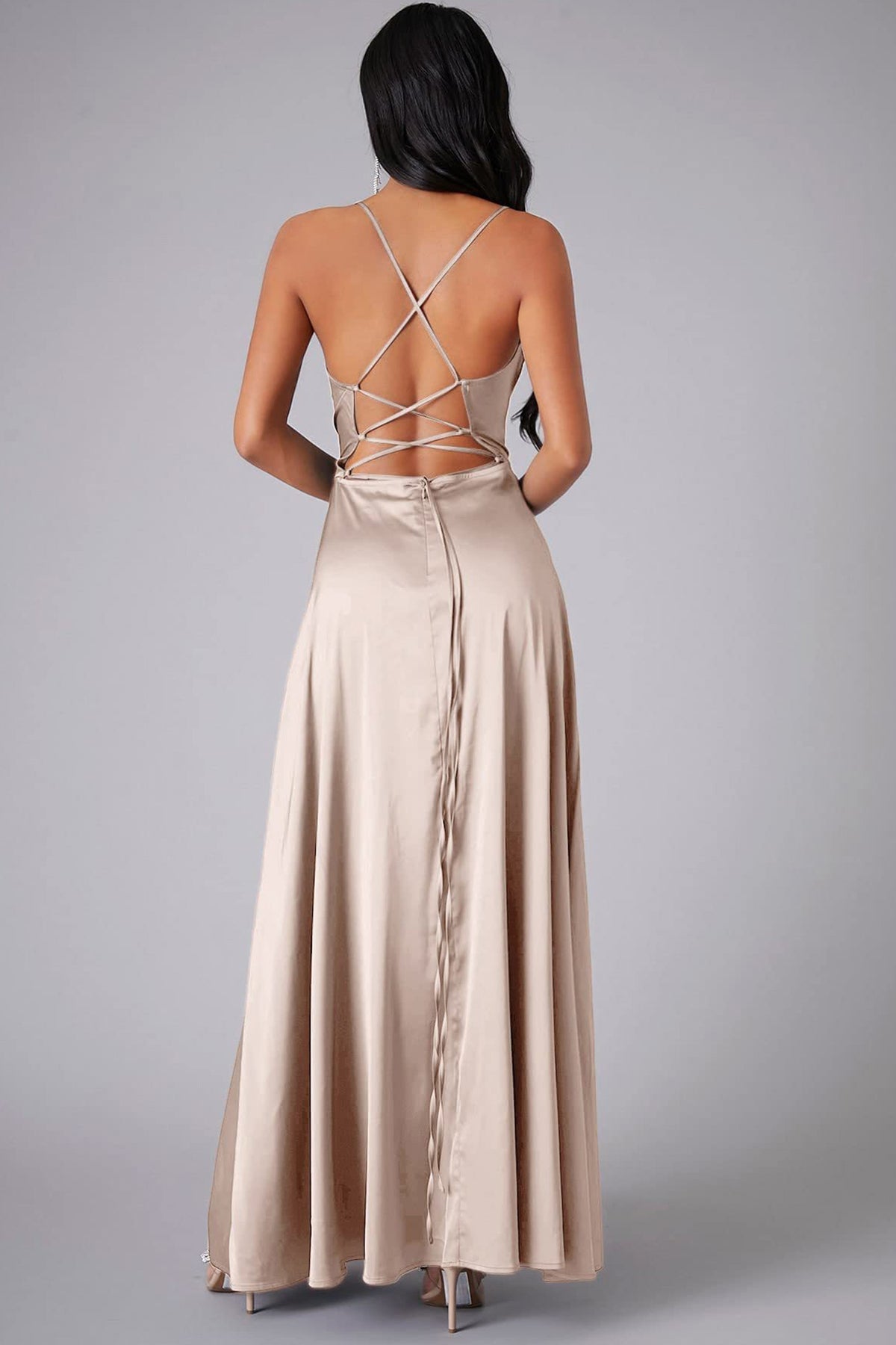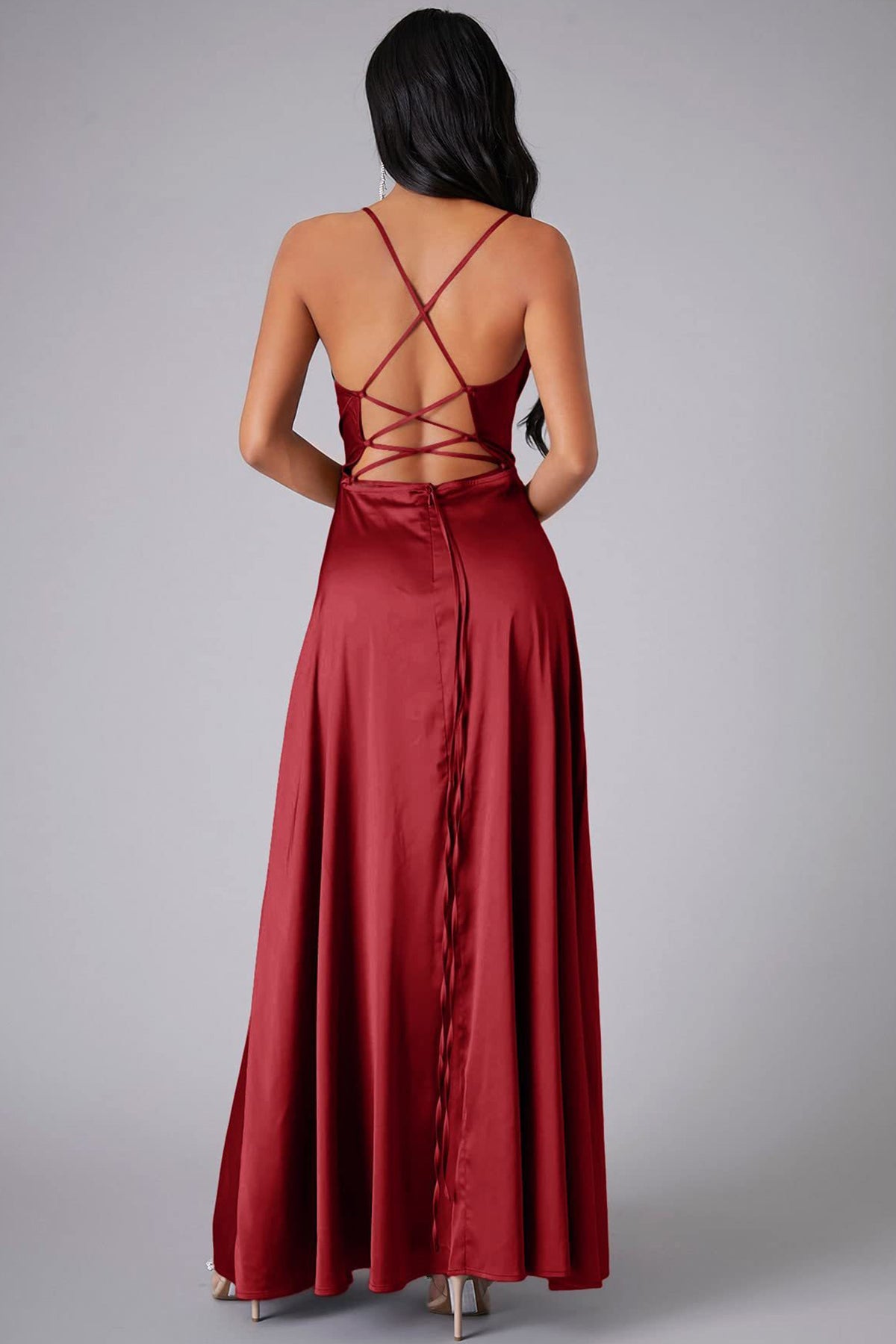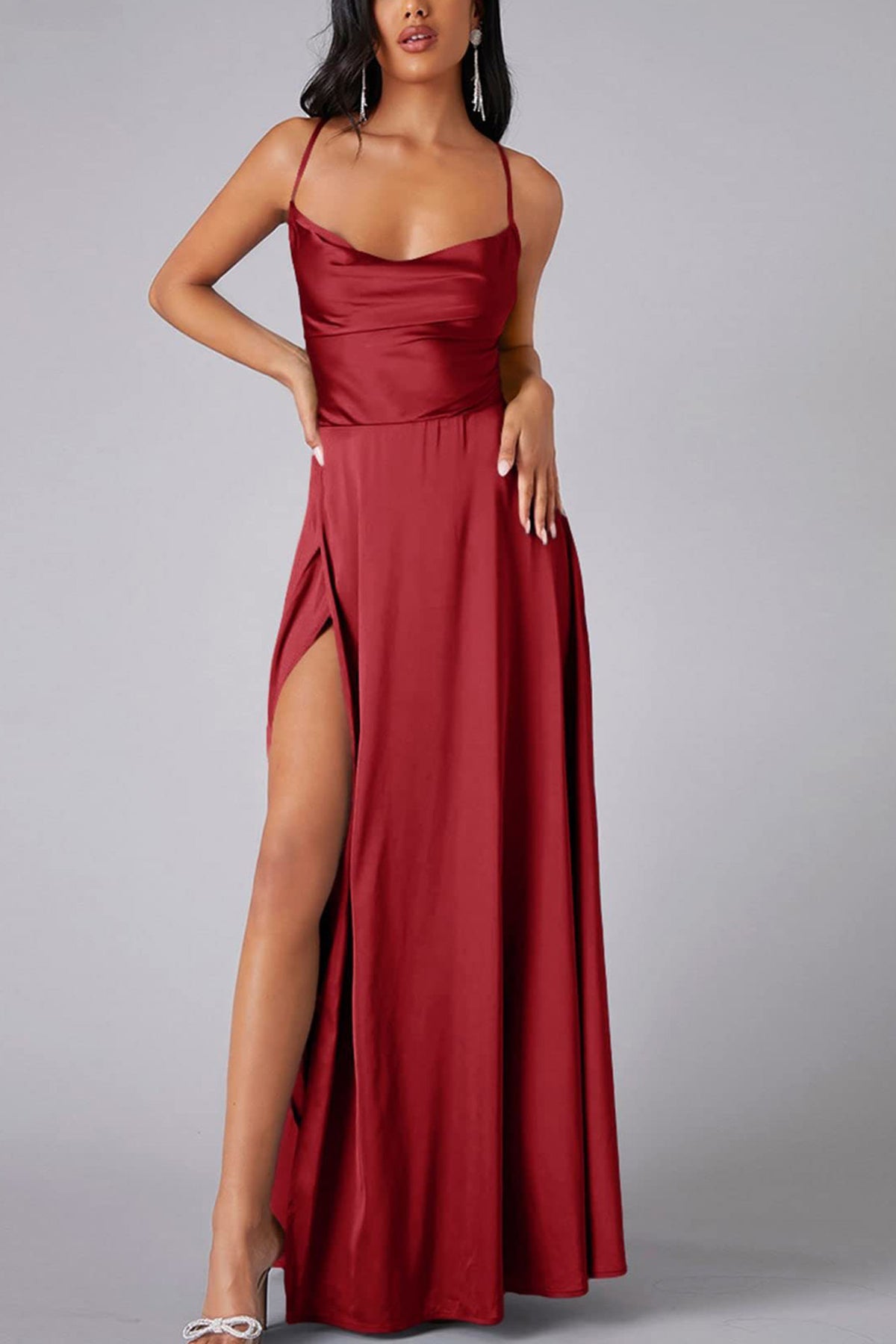 Satin Cowl Neck Tie-up Backless Slit Dress