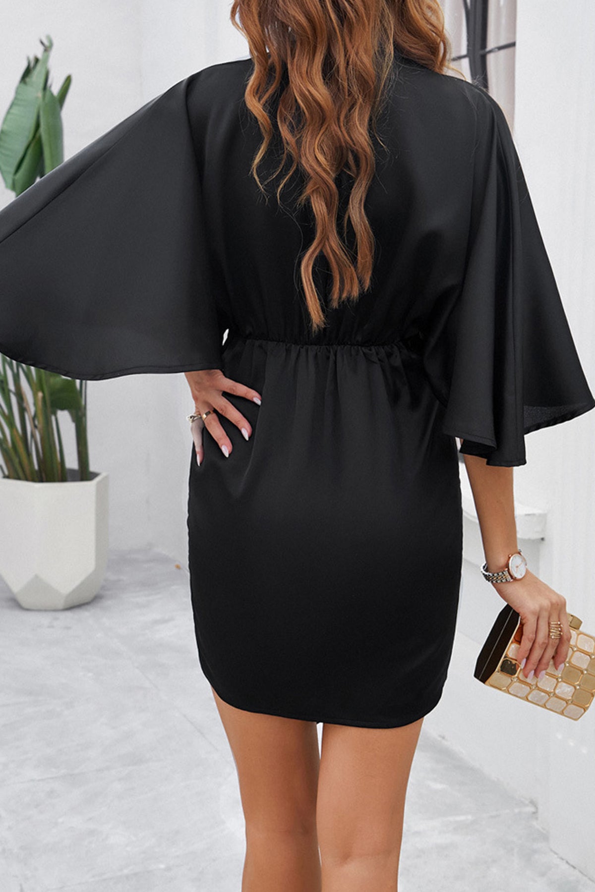 Satin V Neck Bat Sleeve Pack Hip Dress
