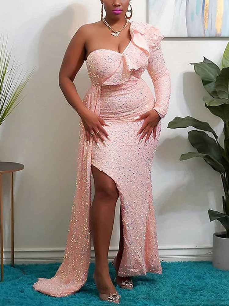 Sequin One Shoulder Slit Ruffle Prom Dresses