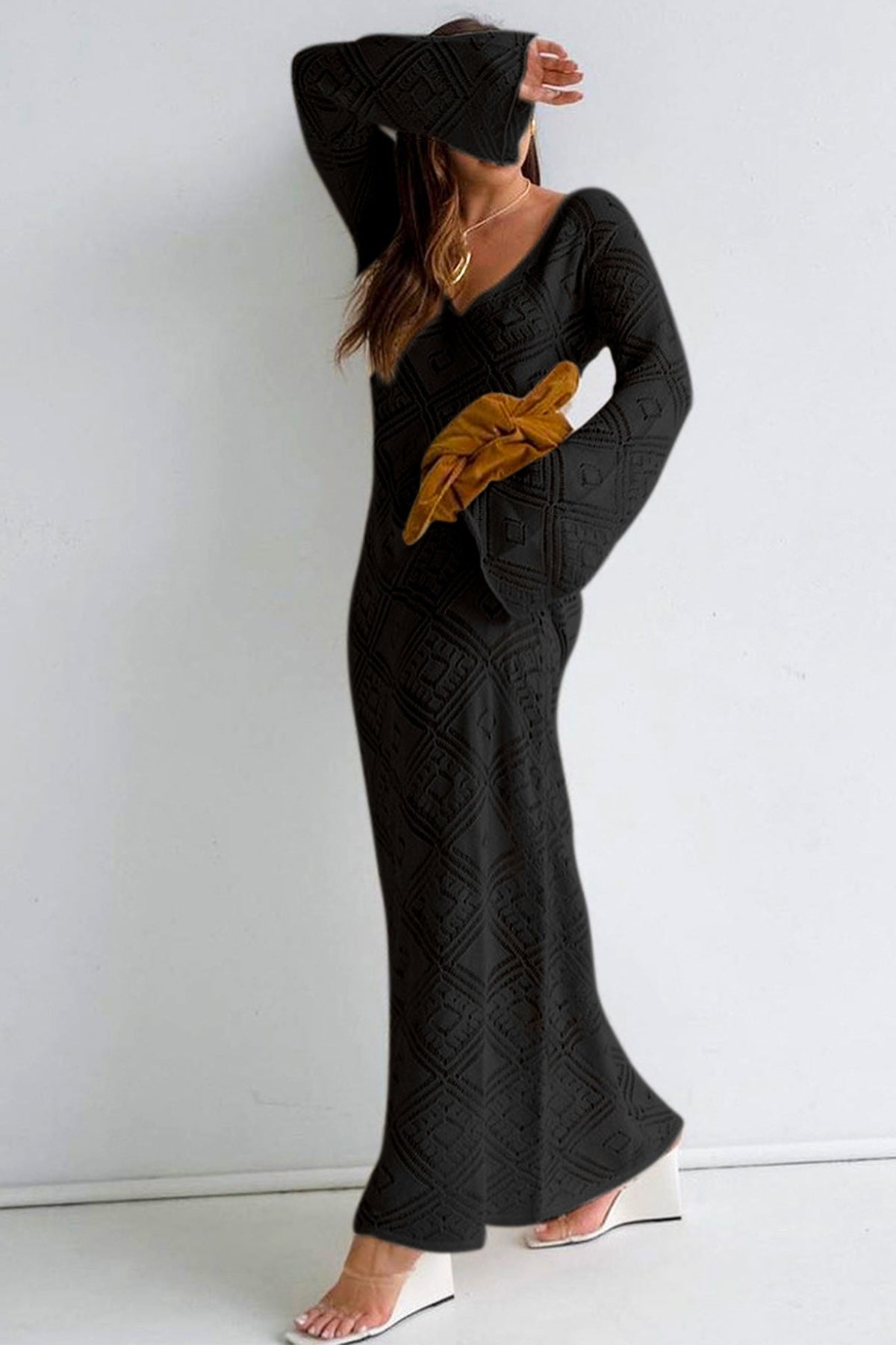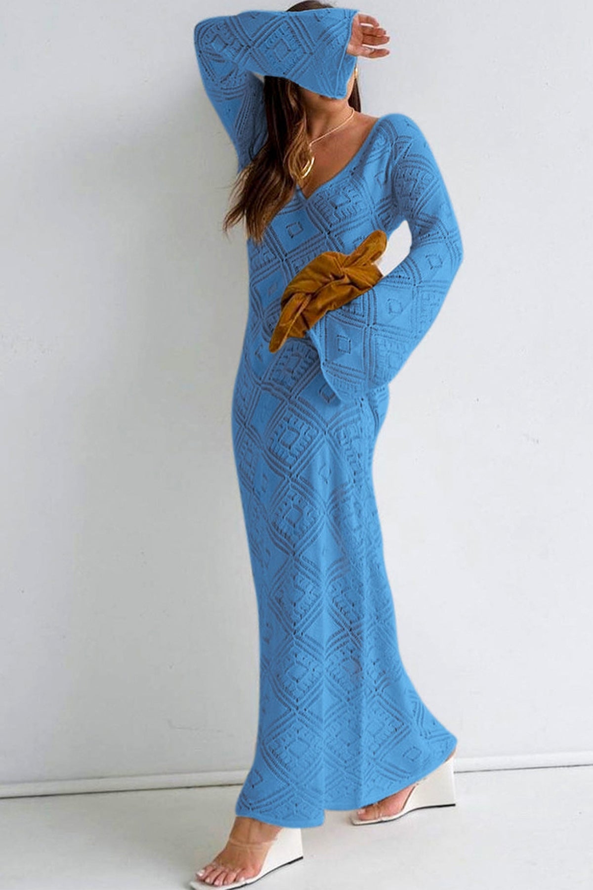 V Neck Crochet Checkered Hollow Out Midi Dress