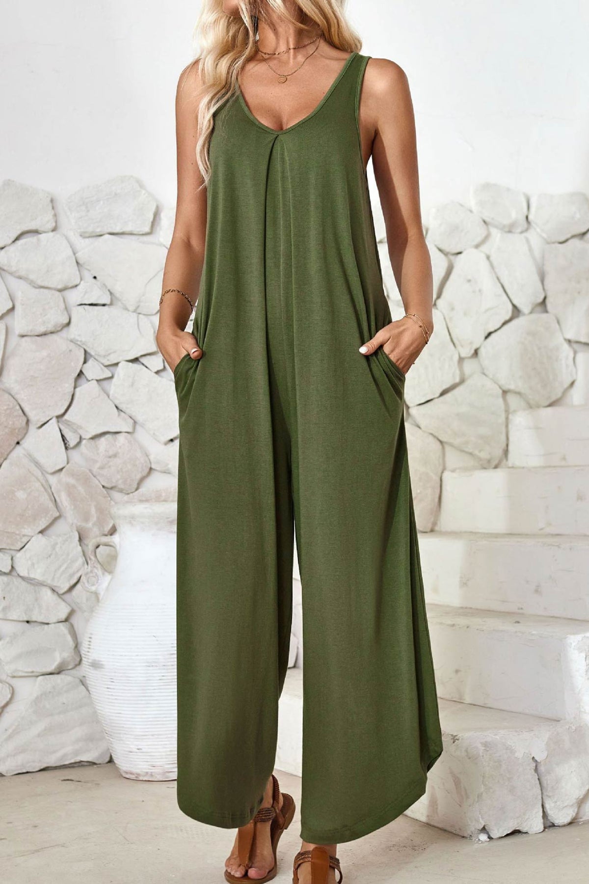 V Neck Solid Irregular Hem Cotton Jumpsuits