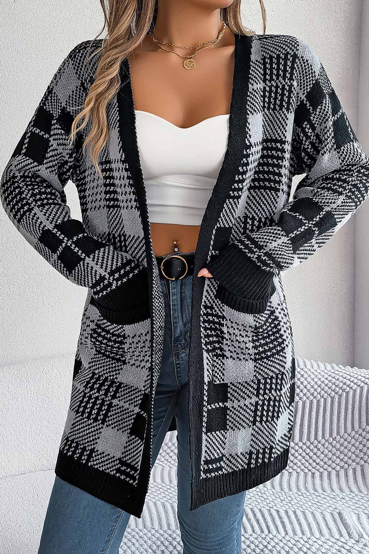 Contrast Plaid Open Front Cardigan