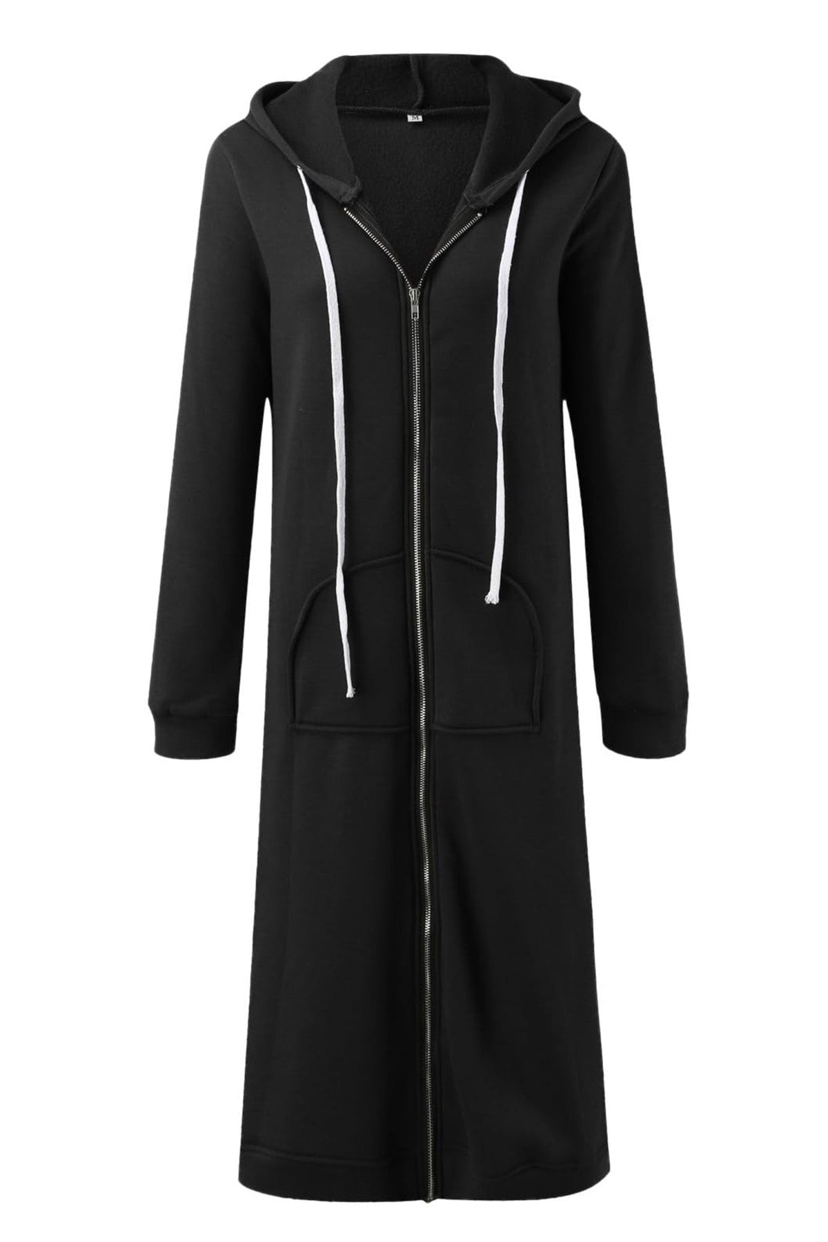 Solid Zip Up Drawstring Hooded Long Cardigan