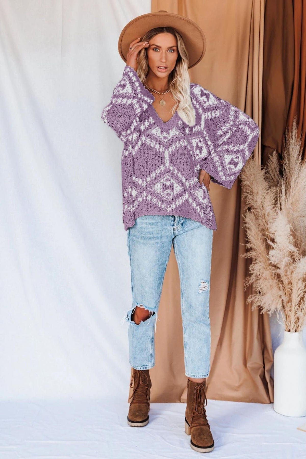 V-neckline Intarsia Knitted Top
